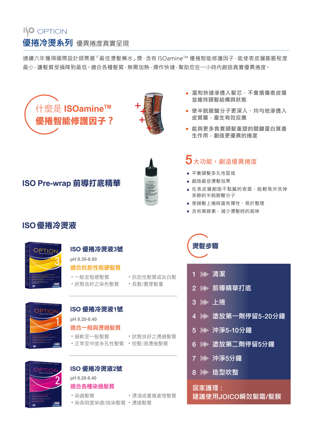 適合抗拒性粗硬髮,一般至粗硬髮質,狀態良好之染色髮質,抗拒性髮質或灰白髮,長髮/豐厚髮量,優異捲度真實呈現,持續六年獲得國際設計師票選「最佳燙髮藥水」獎,含有ISOamineTM優捲智能修護因子,能使表皮層膨脹程度最小,讓髮質受損降到最低。無須加熱、操作快速,在一小時內創造真實優異捲度。